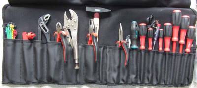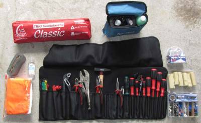 Die Werkzeugtasche mit divesen Zangen, Schraubendrehen, Gripzange (zum Vernieten), Kabelbindern, …
